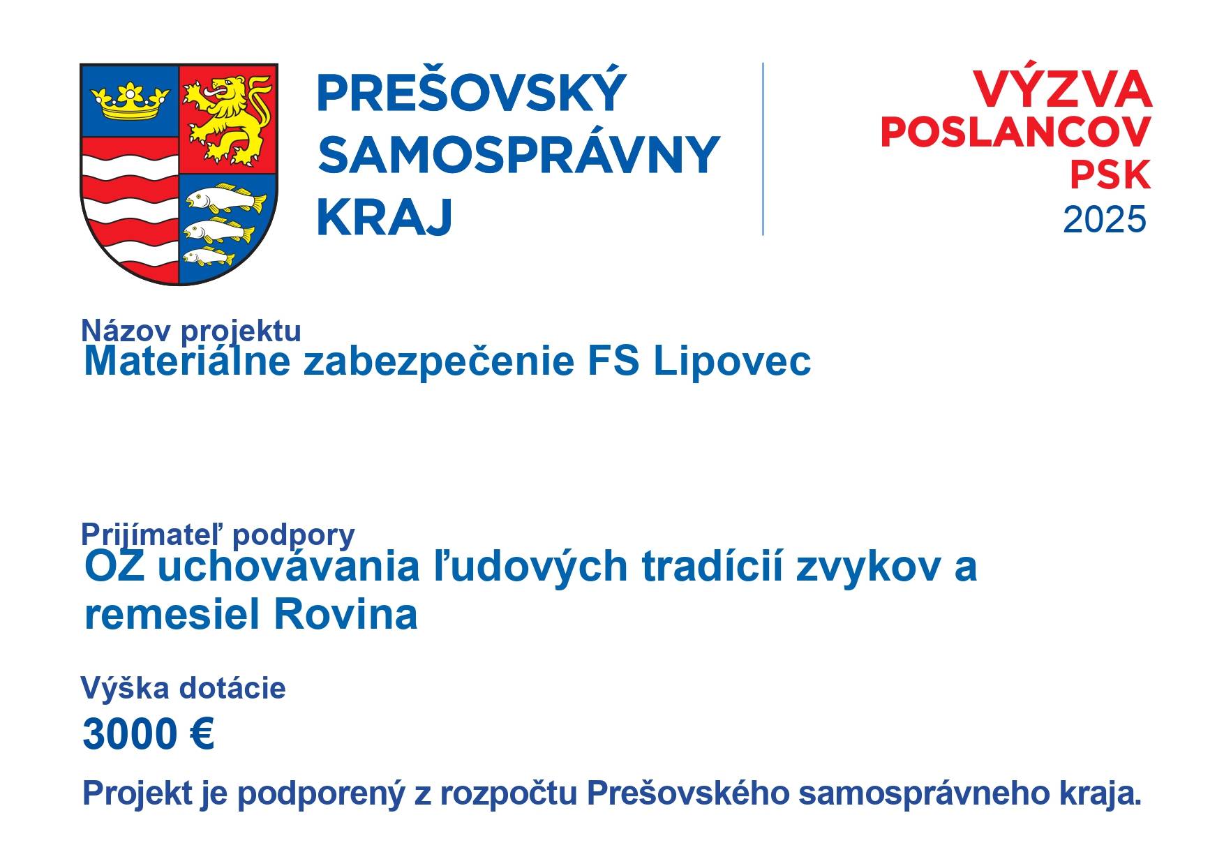 S radosťou oznamujeme, že náš projekt „Materiálne zabezpečenie FS Lipovec“ získal finančnú podporu z programu Výzva posl...